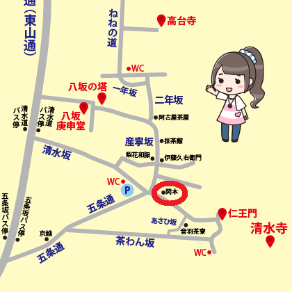 「清水坂観光駐車場」を越え、さらに真っすぐ進むと、「清水坂」の左側に「岡本 清水店」があります。